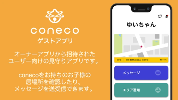 カーメイト製みまもり用GPS端末「coneco」のゲストユーザー向けアプリ。conecoゲストアプリを使えば、登録オーナー以外のご家族なども大切な方を見守り、居場所を共有できます。