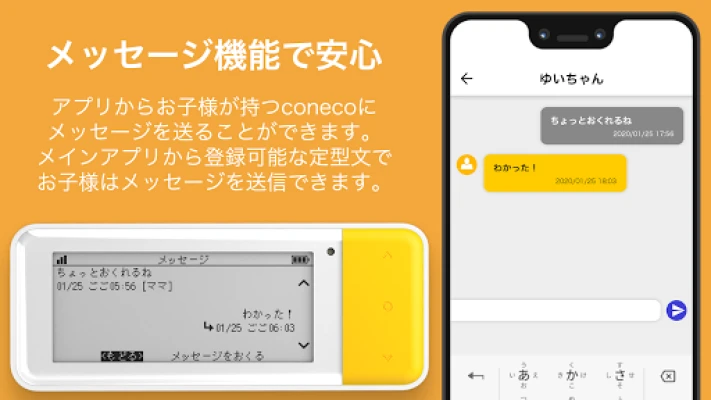 「conecoゲストアプリ」があれば、いつでも「coneco」を身につけたお子様の現在地をマップ上で確認できます。また、過去の移動経路を履歴として振り返ることも可能で、日々の行動パターンを把握するのに役立ちます。さらに、スマートフォンと「coneco」間でのメッセージ送受信は、お子様との繋がりをより身近なものにします。スマートフォンからは全角40文字までのメッセージを送信でき、お子様の状況確認やちょっとした声かけに最適です。この相互のやり取りが、見守る側にも見守られる側にも安心感をもたらします。