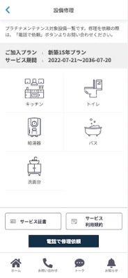 住宅設備の突然の不具合は、大きなストレスとなりがちです。「どこに問い合わせれば?」「手続きが面倒…」そんな時こそ、イエコンの真価が発揮されます。ITの力を駆使し、煩雑なやり取りを解消し、迅速かつ効率的な修理や相談をサポート。また、別途ご案内する定額制修理サービス「イエコンプラチナメンテナンス」にご加入の会員様であれば、アプリが会員証の役割を果たし、対象設備の詳細情報も手軽に確認・管理が可能です。イエコンは、あなたの住まいと暮らしに、途切れない安心と快適さをお届けします。