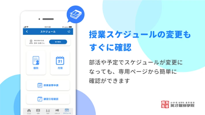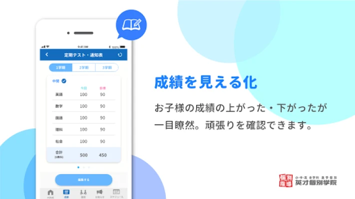 お子様の塾での努力を「見える化」するアプリ。日々の学習状況や進捗を明確に把握し、成長を実感できます。保護者が安心して子どもの学びをサポートできるよう、透明性の高い情報で親子のコミュニケーションを深めます。